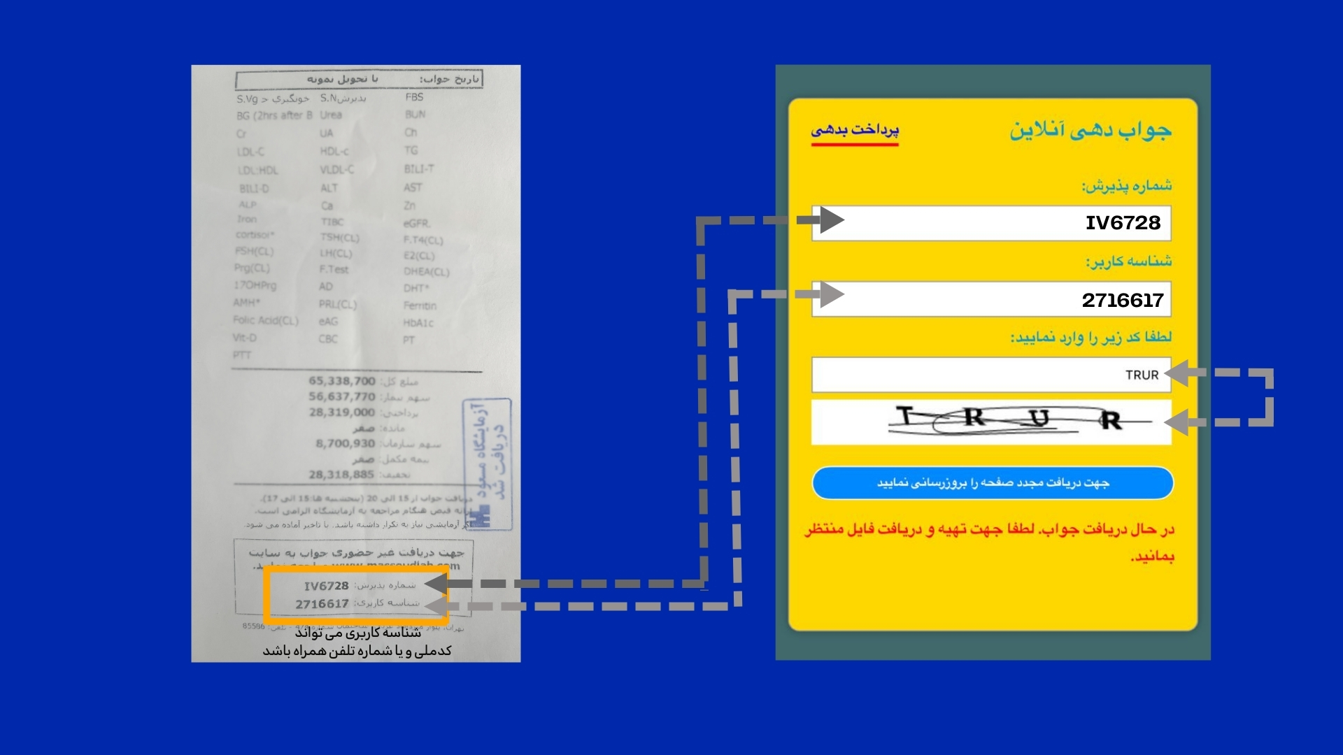 کاربر گرامی ؛ شما می توانید با استفاده از اطلاعات مندرج در قبضی که هنگام پدیزش دریافت نمودهاید، جواب خود را از طریق سایت آزمایشگاه مسعود دریافت نمایید.